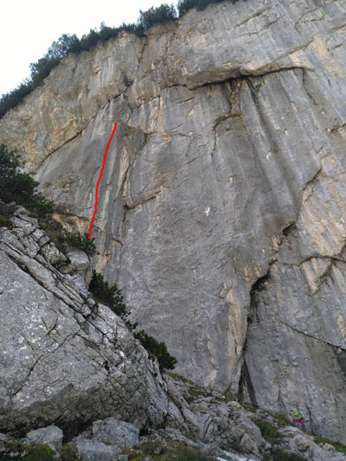 Mit Tom Schlager, einem der aktivsten Erschliesser im bayer. Voralpenraum (Stichwort Taubenstein, Krettenburg) war ich neulich am Edelfels unterwegs. Eigentlich wollte ich ein bereits eingebohrtes Projekt durchsteigen, aber dann entdeckten wir links oberhalb eine superschöne, graue, wasserzerfressene Platte. „Da geht noch was“, meinten wir beide übereinstimmend. Aber die anvisierte Verbindungsvariante zwischen zwei Routen entpuppte sich als nicht wirklich lohnend. Beim Ablassen inspizierte Tom dann eine mögliche Verlängerung einer anderen Route. Diese startet ebenfalls über eine wasserzerfressene Platte, um dann nach ca. 15 m an einem kleinen Dach vorbei leicht überhängend auf die Platte im oberen Wandbereich zu leiten. „Die Crux ist möglich“, meinte Tom und setzte zwei „Erkundungshaken“. Ich checkte anschließend die komplexen Züge und konnte die maximalkräftige Crux entschlüsseln. Noch 10 Haken gebohrt, und am selben Tag gelang mir unter Einsatz aller Kräfte kurz vor Sonnenuntergang die Erstbegehung. Die Hakenanordnung erfordert systematische Vorbereitung. Eine wasserzerfressene 15-m-Platte leitet trickreich zu der überhängenden, maximalkräftigen Einzelstelle (9/9+), die Präzision und höchste Konzentration fordert. Danach folgen weitere 15 glatte Plattenmeter, die mit Disziplin und Ruhe geklettert werden wollen.