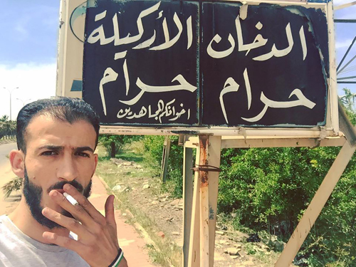 Abo TOW kann nicht nur Panzer anzünden. Abo TOW rauchend vor einem islamischen Rauchverbotsschild demonstrativ eine Zigarette. Dieses Foto brachte ihn nach Assads Mordlisten auch auf die Mordlisten der Djihadisten.
