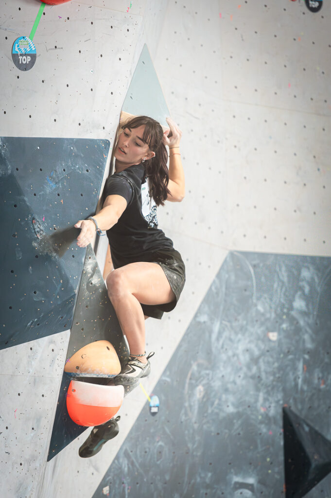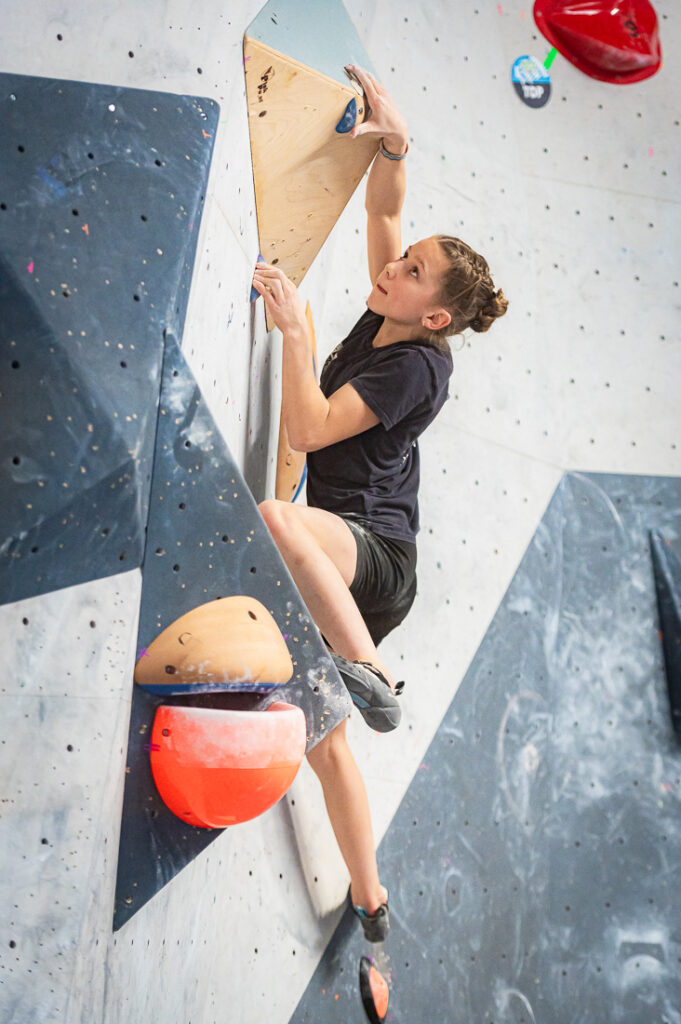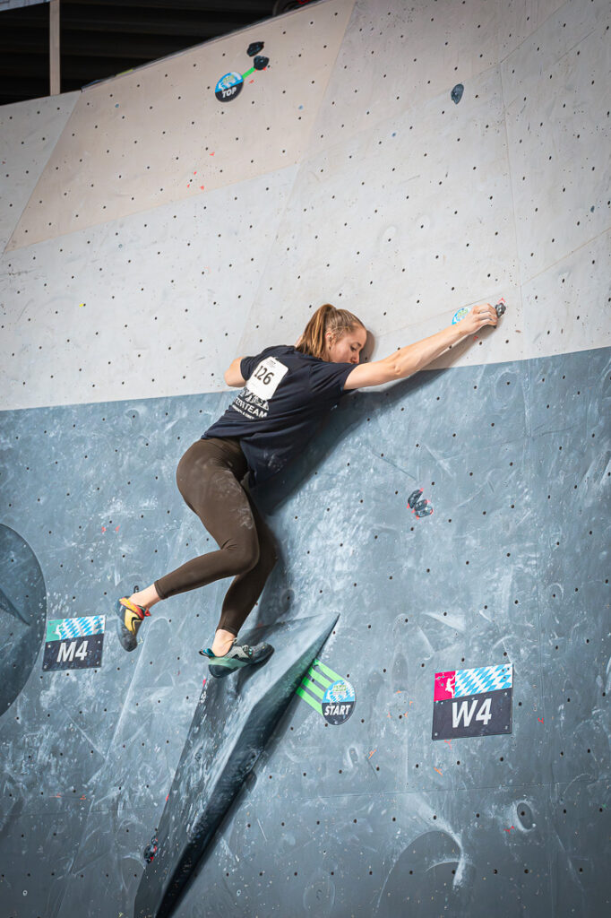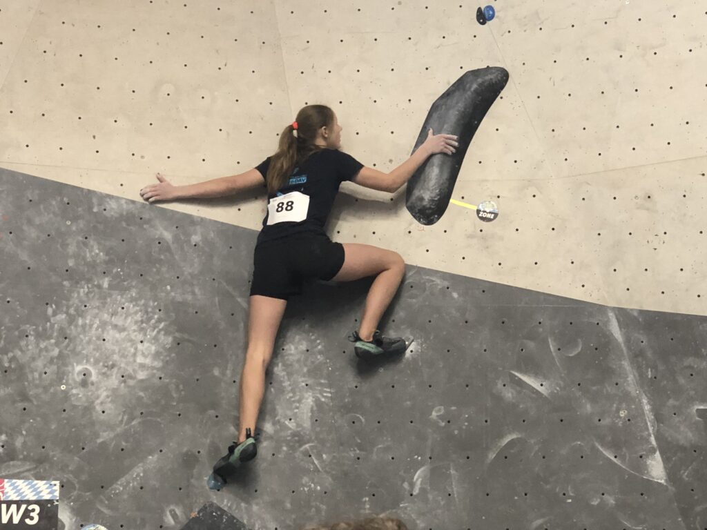 Elise Heyer (München-Oberland) wurde Bayerische Vizemeisterin in der U21 (Foto BFB)Peter Sendele (USC München) dynamisch unterwegs in der Quali U21, er kam im Finale auf Rang 7Action auf der Bayerischen Bouldermeisterschaft (U15/17/21) in Memmingen am 7.2.2026