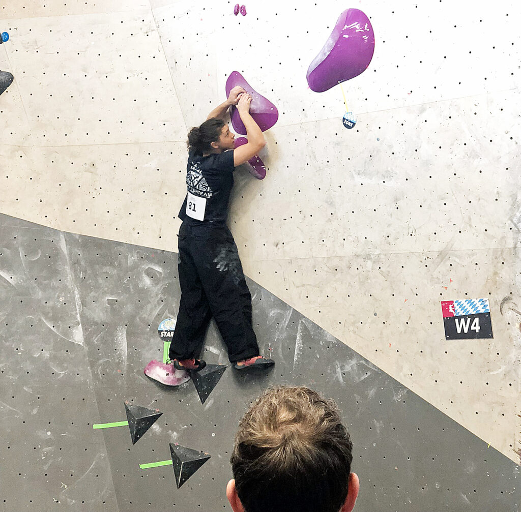 Elly Fassbender (München-Oberland) wurde Bayerische Meisterin in der U21 (Foto BFB)Kyra Dericks (München-Oberland) wurde 3. in der U15 (Foto BFB)Laurenz Krabisch (München-Oberland) erboulderte sich im Finale einen sehr guten 5. PlatzJannik Weiser bespielte den Livestream, direkt nebenan befindet sich „seine“ Videoüberwachungsanlage, ein Meilenstein in der technischen Ausstattung von bayerischen Boulderwettkämpfen (Foto BFB)Profis ohne Grenzen – das Schrauberteam in Aktion: so sah es in den Tagen vor dem Wettkampf ausElisabeth „Lizzy“ Kopp machte wie ihr USC München Teamkollege Peter Sendele Platz 7 im Finale, allerdings in der U17Paula Stöckl (München-Oberland) in der Quali der U17Christian Kupfahl (12. Platz / Allgäu-Kempten)