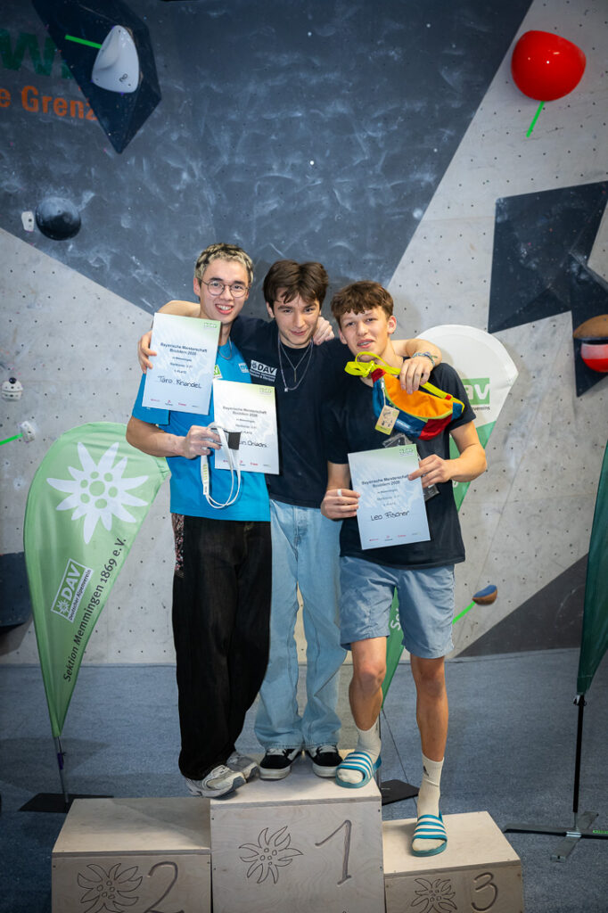 Taro Knandel (Mitte, München-Oberland) flashte im Finale 3 Boulder, den 4. bewältigte er im 2. Versuch und wurde damit souverän Bayerischer Bouldermeister U21, links von ihm Justin Chladny (Vizemeister) Startgemeinschaft SG Ulm, Neu-Ulm, SSV Ulm, rechts: Leo Fischer vom USC München machte Platz 3 (Foto BFB)