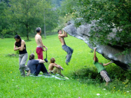 Die hat der große Baumeister aller Welten scheinbar einzig und allein um des Boulderns willen dort verstreut. Die Kombination aus herrlichen Boulderproblemen (aktuell ca. 500) und der einmaligen Naturumgebung wirken extrem motivierend. Fast jeden Tag rissen wir uns an dem scharfen Gestein die Finger (und nicht nur die) wund, es war herrlich. Aber auch darüber hinaus haben wir Einiges erlebt: allmorgendliches Ziegenfüttern, Baden in eiskalten Bächen und Gumpen, riesige Wasserfälle, Stier- und Kuhtreiben, eine Höhenwanderung bis auf 2100m, eine Zirkusaufführung, Wikingergeschichten, einen zweitägigen Fönsturm der sich gewaschen hatte, eine zweitägige Sintflut, die uns durchgewaschen hat, einen extrem unfreundlichen Campinplatzverwalter, eine extrem freundliche Campingplatzverwalterfamilie, einen Höhenmarathon (KIMA) auf dem Sentiero Roma, einen beschrankten Bahnübergang der immer geschlossen ist, Pflanzen die in einem Wohnwagen Urlaub machen usw. Aber natürlich stand im Mittelpunkt der wahre Ernst des Lebens, sprich: Bouldern, Bouldern, Bouldern.