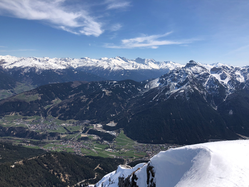 Die Schneeverhältnisse sind Mitte April nicht mehr optimal. In Innsbruck sind sogar 23° vorhergesagt. Aber in höher gelegenen, nordseitigen Rinnen und Karen könnte noch was gehen. Der 2556 m hoch gelegene Ampferstein in den Stubaier Kalkkögeln bietet eine solche Rinne/Kar. Tief eingeschnitten und bis zu 40° steil, liegt hier bis in den Frühsommer hinein Schnee. Angesichts der ungewöhnlich hohen Temperaturen, war der Aufstieg eine rechte Plackerei. Belohnt wurden wir jedoch mit einem herrlichen Gipfelrundblick der von den Nördliche Kalkalpen (Lechtaler, Wetterstein, Mieminger, Karwendel, Rofan, Wilder Kaiser, Berchtesgadener) über die Zillertaler Zentralalpenkette mit Olperer, die Silvretta mit Zuckerhütl bis zu einige Spitzen der Ötztalern reichte.
