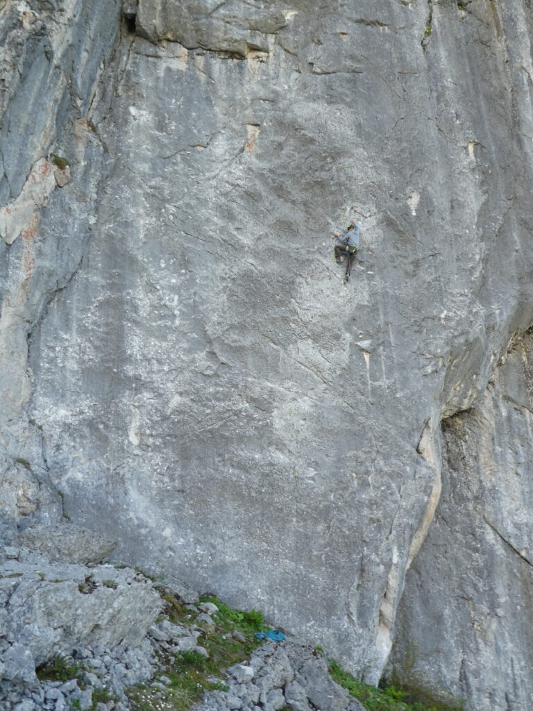 Die 8a ergab sich schon im zweiten Versuch. Kann das überhaupt 8a sein? Zwar habe ich schon einige echte 8a geknipst, aber die Fragole weist mit knapp 200 Begehungen auffällig viele Bezwingende auf. Dennoch: ich fand sie subjekiv „sauschwer“, wie die Bayern zu sagen pflegen. Es hatte 27°, viel zu heiß um an kleinen Griffen zu zerren. Die 200 Begehenden (und noch viele mehr, die nicht hochgekommen sind) haben einige Griffe und Tritte glattpoliert. Aber ok, wer sich mit Graden befasst kommt nicht weiter. Deshalb: es war eine meiner schwersten Routen, die ich bisher geklettert habe. Subjektiv habe ich es so empfunden und das zählt ;).